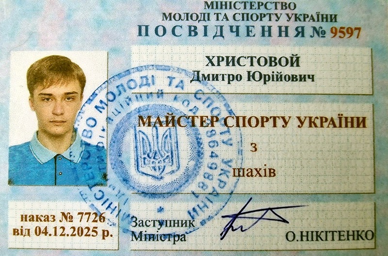 Наказом Міністерства молоді та спорту України від 4 грудня 2025 року № 7726 Дмитру Юрійовичу Христовому присвоєно спортивне звання "Майстер спорту України" з шахів. 19-річний шахіст, який представляє Кам`янську ДЮСШ № 3 (тренер Дмитро Задорожний), 14 грудня отримав відповідне посвідчення серії № 9597.