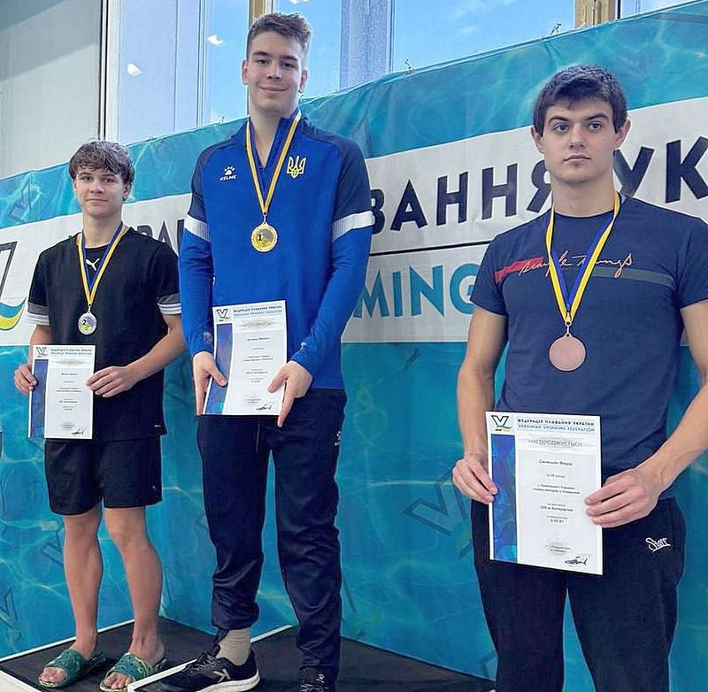 На фото: Призери серед юнаків на дистанції 200 м батерфляєм: 1 - Микола Котенко (Кам`янське), 2 - Денис Малиш (Дніпро), 3 - Федір Синящок (Київ).