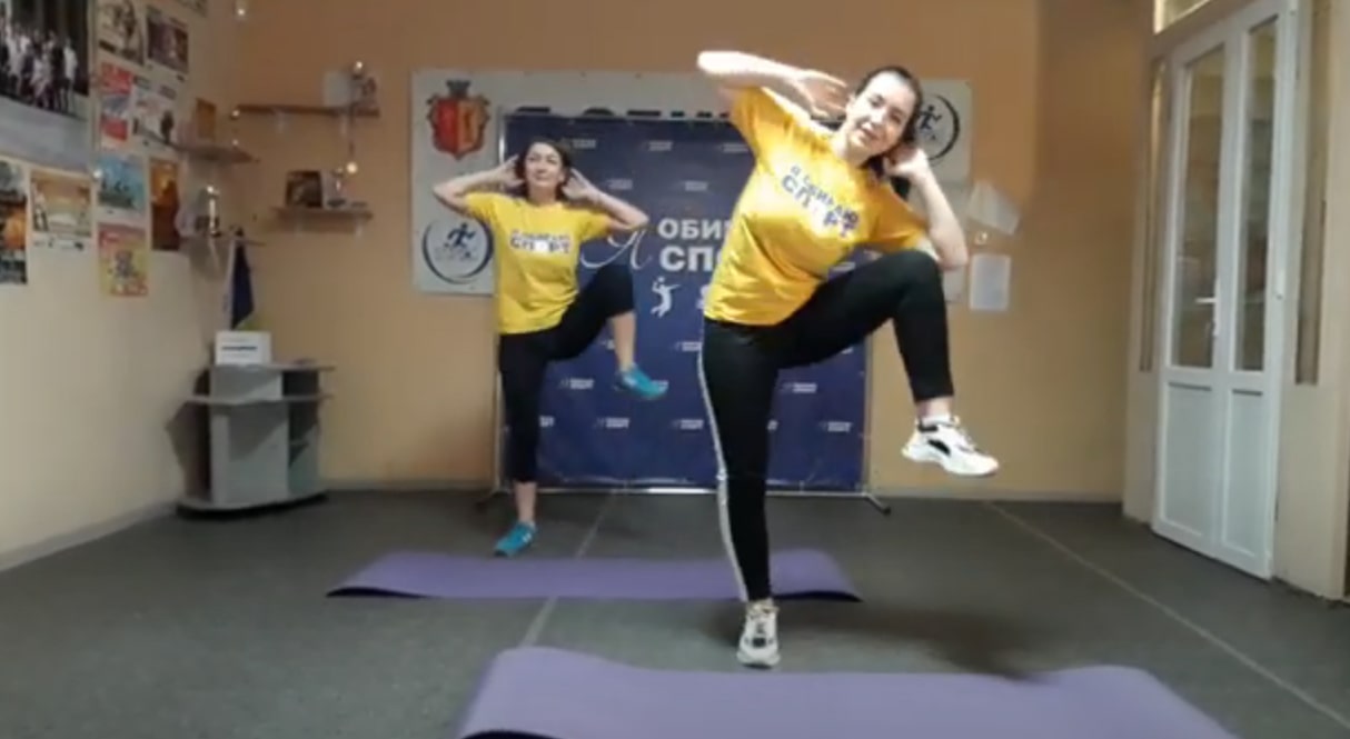 Фахівці Кам`янського комунального закладу "Спорт для всіх" Дар'я Сімковська і Світлана Швець демонструють комплекс фізичних вправ "ТАВАТА".